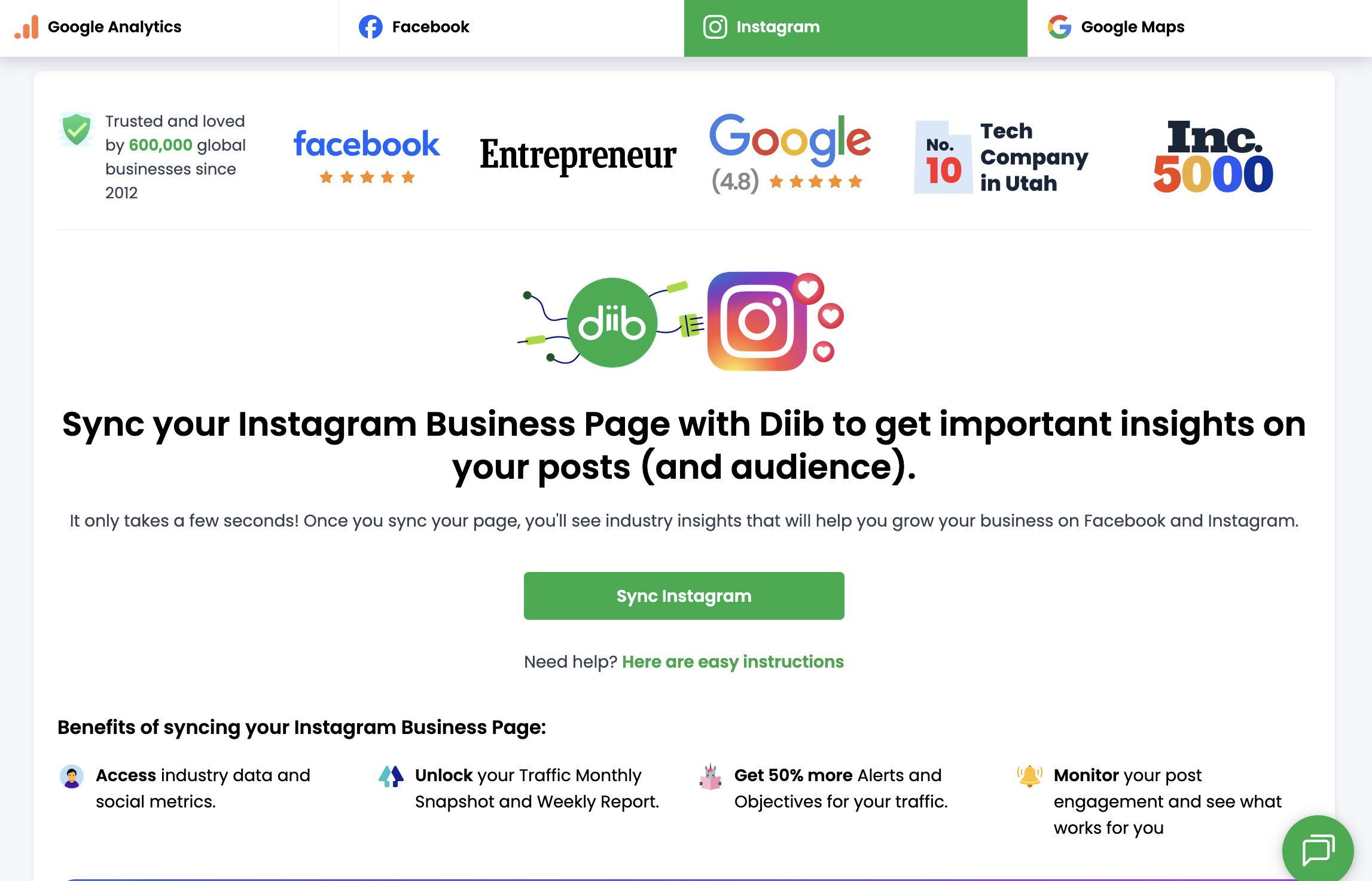 If your business uses Instagram, syncing it with diib makes a big difference. Once it's connected, you’ll see all your Instagram stats (like followers, reach, and engagement) right in your diib dashboard. This helps you understand what’s working and where you can grow, without having to jump between apps.