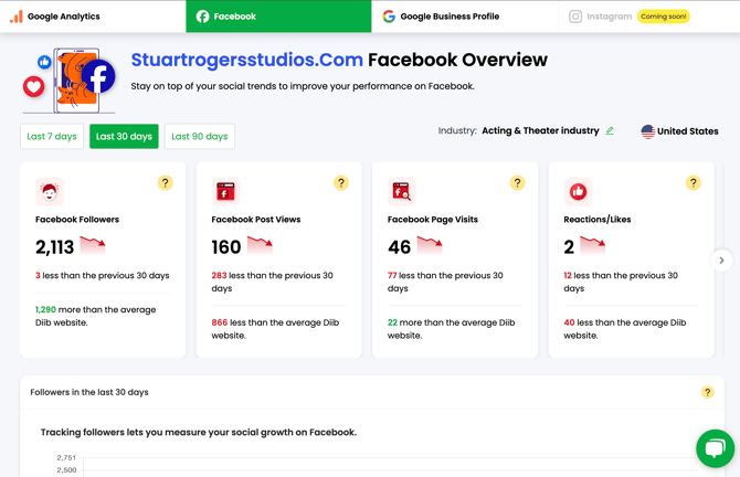 Once you’ve allowed diib access, you’ll be redirected back to your main dashboard. Go back to your Facebook analytics tab, and you’ll see your data!